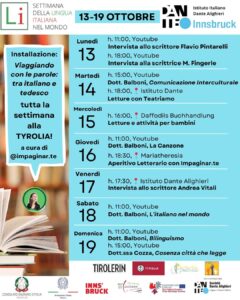 In occasione della Settimana della Lingua Italiana nel Mondo 2025, il Comitato di Innsbruck della Società Dante Alighieri organizza vari eventi tra il 13 e il 19 ottobre: Lunedì 13 ottobre ore 11:00 Intervista su YouTube con lo scrittore Flavio Pintarelli ore 18:00 Intervista su YouTube con la scrittrice Maddalena Fingerle Martedì 14 ottobre ore […]